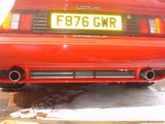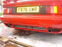Complete re-badging of rear Lotus, both sides Esprit Turbo SE, Lotus Design and wheel centres. Chargecooler badge already fitted all supplied by Bell and Colville. (Completed 26th April 2006)Rear valance fabrication for new twin-exit exhaust system (To be finished/touched up).