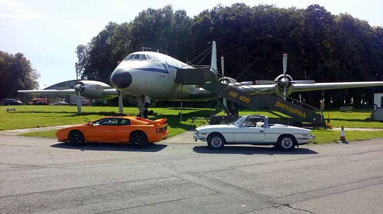 Out with Sid owen (DAD ) with his pride and joy triumph STAG , trying his best to keep up with the V8 ESPRIT at RAF Kemble , all good English products with brittania in background , good times