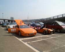 Believe it or not everything in the photo (above left) went in the Esprit, including Jim who is 6'4" tall. As a bit of fun we fitted twin water jets to the rear engine cover one pointing left and one right. These were connected to a water tank in the boot, then to a handheld toggle switch in the cockpit. The reason for this was, as anyone who has been to Le Mans knows, is that when you pass the circuit campsites or drive through Arnarge village people will leap out of nowhere with supersoaker water pistols and drench anyone on an open car or foolish enough to leave windows or sunroof open, so this year we decided to get our own back. You should have seen their faces when we soaked them back. The only ones who were not amused were the two Policemen we hit by mistake. A swift exit was the only answer. If you look carefully you can see the jets taped to the engine cover with the water pipes going through the engine vents. For next year we are planning something directional with remote control. Almost like a starting grid. Waiting for the Ferry back to England, in Bolougne.