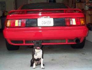 Above left: This was my car when I first bought it in 1997. And the viscious beast guarding it is my killer attack dog Kobe. (Isn't he the cutest dog ever?) Kobe knows how much I love that car and would probably guard it with his life. And for when Kobe's off duty, I installed a Compustar Alarm with pager. This car CANNOT be started without the key and remote... by anyone, not even me.