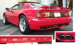 Above right: New rear Esprit Decal, Dual Flowmaster exhaust, Double chrome tips on each side I love the sound of the Flowmaster, especially at it's resonance. It's pretty loud but not obnoxiously loud. The sound now matches how the car looks like it should sound. I originally had one tip on the right side, then two dinky tips one on each side, and then double tips on each side. But in order for the larger double tips to fit, I had to cut out a little bit of the valence and paint it.