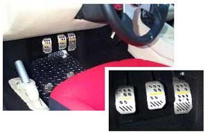 Above left: Lotus aluminum brake handle, MOMO aluminum race pedals, Aluminum diamond plate floorboard, Aluminum door sill protectors The diamond plate floorboard was put in to secure the 6pt. harnesses, but it also eliminated the annoyance of the floormat shifting. Got the diamond plate idea from Johan and his SuperBee. I realized after making it that the Extreme Esprit site sells them. It would have been worth it to buy it rather than making it.