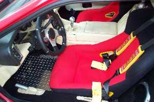Above right: Momo race seats, Schroth 6pt Hybrid Harnesses-driver, Sparco 4pt harnesses-passenger I had to dismantle the driver's seat to recline it a bit and to make some room around the arms. I couldn't shift into second and I didn't like sitting so upright. After welding it back together, I put the fabric cover back on and now it's more comfortable than the stock seats were. And here's a better view of the parchment leather color. I don't think these seats would have worked with the old tan colored leather.