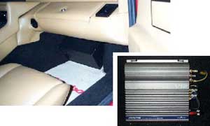 Above right: Ported subwoofer w/two 5" drivers, Alpine V12 amp I installed the subwoofer in the passenger footwell which was the most unobtrusive spot I could think of. It fits in there so perfectly that most people don't even realize it's there. Also, the footwell in itself creates sort of a natural subwoofer effect and results in the tiny sub pumping out a whole lot of bass. It definitely lacked bass before installing the sub, but with it... there's more than enough.