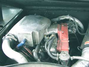The engine is modified to a high lift cam on intake, ultra lightweight JE pistons (forged aluminium alloy,35 grams), Dellorto 45's (but thinking I will switch back to 40's for better response low end) and the charge cooler box on top. Twin radiators for chargecooler are soon to be installed in the fiberglass trim pieces (flush with top surface, angled 15 degrees inward)on either side of engine bay just inside of rear 1/4 panel windows. The hatch window is gone and hot air from chargecooler radiators will be vented out from there using electric fans mounted under radiators. Spark is enhanced with the sequential pulse ignition module (about 20 sparks in rapid sucession per stroke).