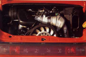 Displacement of the RS's dry-sump engine is increased from 3.6 to 3.8 litres (how much bigger can this venerable flat-six get?) by widening the bores from 100mm to 102mm. Though larger in diameter, the pistons are lighter. So are the rocker arms. Other changes include new Motronic control of the ignition and injection, cleaner gas flow from the intake to exhaust, and a dual oil cooler. Power goes up from the normal Carrera 3.6's 250bhp at 6100rpm, to 300bhp at 6500rpm virtually the same output as the Lotus's, and 50bhp short of the RSR's and the rev limit has been raised to 7100rpm. Torque is up from 224lb ft to 260lb ft, which is a match for the Esprit S4's but not the Sport 300's.