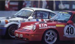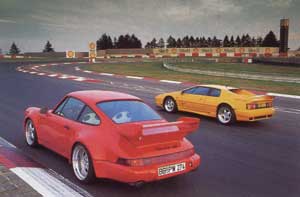 while Lotus Esprit didn't last (left). Porsche 911s in wheel-to-wheel formation (right).It has been proposed that the future of sports-car racing lies with GT cars, which currently race in a number of different series and events around the world. First, there's the Le Mans 24-Hours, which this year had class for GT cars: among the entries were a Jaguar XJ220, a Porsche 911 Turbo, a few Venturis and a couple of Lotus Esprit Sport 300s. There are also national championships in Germany, Holland and Italy, where (mainly) weathly amateurs race Porsches, Ferraris, Hondas and their ilk. And IMSA in the US runs a series for production supercars in which, in 1992, Porsche took the manufacterers' title, and Lotus the drivers' title.