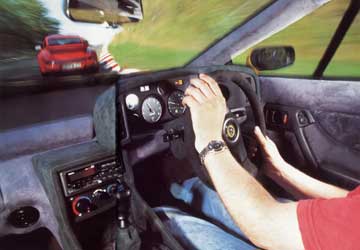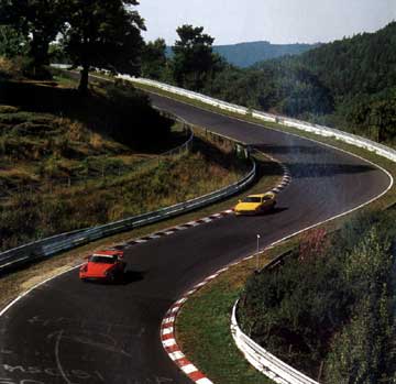 Cars approaching Wipperman bend on old Nürburgring.However you look at it, the startling Esprit is visually the more dramatic car, the one the Germans flocked around to admire. Mind you, given that Porsche are two-a-pfenning at the Nürburgring, that's not so surprising. It eclipses the stark RS for cabin opulence, too: Lotus could do a lot worse than adopt the Sport's lovely, non-reflecting suede and damask trim for the S4. It looks terrific, creates the right ambience, suits the car. Its Lotus-made bum-pincher competition seats, though, are difficult to access, particularly on the driver's side where the wide sill, low steering wheel and obstructive up-your-trousers handbrake (albeit a fly-off one than can be laid flat) hinder entry. Getting into the Porsche's Recaros is much easier: the door gap is wider, the sills narrower, the wheel much higher, the cabin more spacious. What's more, the RS's lovely stitched-leather seats are better padded to avert the numb-bum syndrome that the Lotus driver suffers after a couple of hours behind the small Nardi wheel. More buttock cushioning would not go amiss. Ditto more under-thigh support.