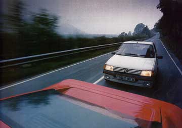 I swapped with Fraser at Scotch Corner. Here was a chance to fly, literally. The A68's sharp peaks will put air under all four wheels at perfectly modest speeds. Everything is lighter, easier, in the 205. Here is a car that lives on its nerves, its throttle hair-trigger keen; on the twists and swoops of the A68, the 205 scampered and lunged, its safety margines so high that no averagely sane driver need feel anything other than pleasure. On later M90 multi-lane driving, the Pug's more compliant ride and generous bushing made it the quieter cruiser, its all-round vision, despite little mirrors, excellent.