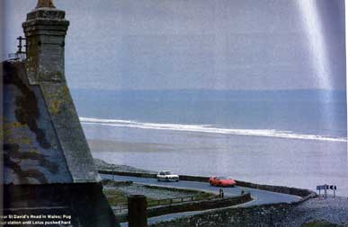 Bodmin Moor we traversed in a trice on the A30 dual-carriageway; unleashed, the Lotus would have trounced the 205. Exmoor was sterner stuff. Again, the Peugeot held station on tight rain-lashed roads; light controls, friendly handling and giant-killing performance kept it in touch. It was here, though,. that the Lotus finally snared my affection. As all-purpose transport, the Peugeot is the better car; on give-and-take roads, it can cover ground as quickly as anything on four wheels. It chased the Lotus with alacrity, but it failed to match the excitement generated by its quarry.