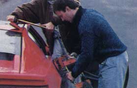 Narrow, twisting roads and my unfamiliarity with the Lotus allowed Stinson in the 205 to overtake a few stragglers and pull clear. The Esprit is a wide beast (broader than a Merc S-class), and when you're driving it on the 'wrong' side of the road, unless you can see a fair way ahead, you daren't start edging out for a peek. During my efforts to catch up, I began to enjoy the Esprit and my confidence grew. It needs to be driven hard before it reveals much advantage over the Peugeot. The fast it goes, the sharper its responses become and the more spirited it seems. And it has such phenomenal acceleration it simply explodes between bends and past other cars. The 205 was rapidly caught, so I began handing back to do it all again.