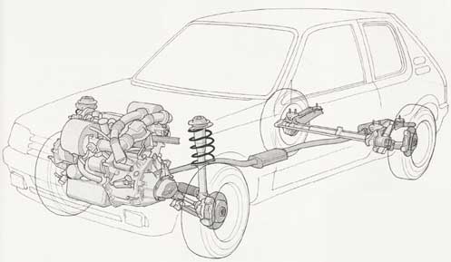ENGINE LOTUS PEUGEOT Configuration In-line four In-line four Capacity (cc) 2174 1905 Bore (mm) 95 83 Stroke (mm) 76 88 Compression (to one) 8.0 9.6 Valve gear Dohc, 16v Sohc Aspiration Twin carbs, turbo Fuel injection Power (DIN/rpm) 215bhp/6000 130bhp/6000 Torque (DIN/rpm) 220lb ft/4250 119lb ft/4750 TRANSMISSION Type Five-speed manual Five-speed manual Ratios (mph/1000rpm) First 3.36 (5.80) 2.92 (6.20) Second 2.05 (9.50) 1.85 (9.80) Third 1.38 (14.10) 1.36 (13.30) Fourth 1.03 (18.70) 1.07 (16.90) Fifth 0.82 (23.70) 0.86 (20.90) Final drive ratio (to one) 3.88 3.69 CHASSIS AND BODY Construction Steel backbone chassis, glass fibre body Steel monocoque Front suspension Independent, upper and lower wishbones, coil springs, anti-roll bar Independent, MacPherson struts, coil springs, anti roll bar Rear suspension Independent, transverse links with radius arms, coil springs Independent, trailing arms, transverse torsion bars, anti-roll bar Steering, type Rack and pinion Rack and pinion Turns lock to lock 3.0 3.8 Turning circle (ft) 36.0 33.8 Wheels 7.0x15 front, 8.0x15 rear 6.0x15 Tyres 195/60 VR15 front, 235/60 VR115 rear 185/55 VR15 Brakes, type Discs all round, vented at front Discs all round, vented at front DIMENSIONS (in) Wheelbase 96.8 95.3 Front track 60.0 54.4 Rear track 61.2 52.7 Overall length 170.5 145.9 Overall width 73.2 61.9 Fuel tank capacity (gal) 17.3 11.0 Kerb weight (lb) 2795 1929