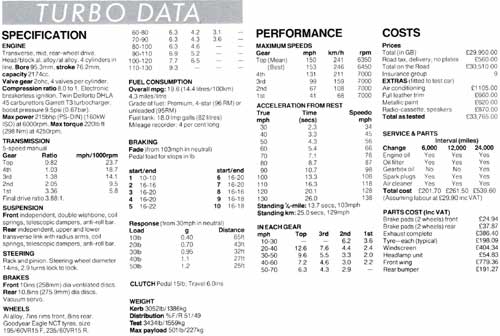 From zero to 100mph takes the new Esprit 13.3 secs and the quarter mile 13.7 secs, the kilometre mark coming up in 25 secs dead at 129mph. The old Turbo Esprit HC managed 60mph in 5.6 secs, the quarter mile in 14.4 secs at 99mph, 100mph in 15.0 secs and the kilometre in 26.2 secs at 122mph. The new Esprit Turbo is in Porsche 911 and Ferrari 328 territory.