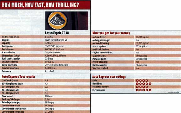 The new Esprit V8-GT is a back-to-its-roots move for Lotus and what smart manoeuvre it has been. The few creature comforts to mollycoddle the driver, and with expensive options a driver airbag costs nearly £1,500 adding extras will cost you dear.But the back-to-basics layout of the new, much-improved cabin sits comfortably with the nature of this car, while the transmission changes have improved the driving experience. Performance, of course, speaks for itself: the 350bhp V8-GT is capable of 170mph and sprints from 0-60mph in less than five seconds.