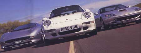 And so we lined them up, side by side, to see which one went fastest. Initially, there wasn't any point even looking at the statistics. The all-wheel-drive 911 squatted dramatically, chirruped its rear tyres momentarily and screamed into the distance, leaving the Ferrari spinning its rear wheels aimlessly over the first few feet with the power-sapping ASR turned off, and the Jaguar struggling to balance off-boost lethargy with on-boost rear tyre meltdown. The 911 catapulted itself to 30mph in a gut-wrenching 1.63sec, the same time we recorded for the McLaren F1 a few years ago. Against it the 550 (1.92sec) and Jaguar (1.99sec) appeared to be walking away from the line. Rifling up the Porsche's gearbox is a piece of cake for anyone with a driving licence, in contrast with the heavy, ponderous shift of the Jaguar and the deliciously mechanical feeling (but slower) gearchange of the Ferrari. The 911 maintained its crushing lead up to 60mph (3.84sec versus 4.31 for the 550 and 4.23 fro the Jaguar), but from here on it became a power thing. Although the 550 failed to overtake the 911 by the time 100mph appeared, it got close , pulling back a couple of tenths on the Porsche and ducking under the tape in 9.41sec, versus the 911's 9.17sec.