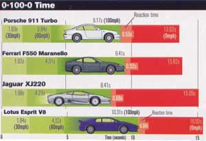 But even if the 220's brakes and tyres had been functioning perfectly, I seriously doubt that it would have beaten either the Porsche or the Ferrari on the day. Between them these two represent the sharpest end of contemporary road car brakes. The most stunning thing for me is that the Ferrari managed to outbrake the Porsche by a whisker, despite carrying an extra 186kg of kerb weight. Not by enough to make it fastest outright; the 911 gets to 100mph just a shade too quickly for the 550 to be able to make up the difference under brakes. But the fact that the Maranello stopped faster than the Turbo at all had to be seen to be believed.