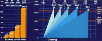 5th gear: 172mph/6750rpm, 4th: 129/7200, 3rd: 96/7200, 2nd: 65/7200, 1st: 40/7200ACCELERATION