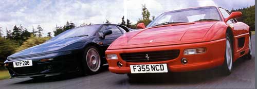At least the 3.5-litre unit produces monster torque: 295lb ft at 4250rpm, nearly 30lb ft more than the Ferrari, which needs almost another 2000rpm to reach maximum twist. In the first two gears, boost is limited to 0.5bar to save the gearbox – the same Renault 30/GTA-derived transaxle beloved of GT40 replica builders but now with synchromesh on reverse – but the Lotus always has the grunt to chirrup the huge rear tyres and unsettle the traction. The chassis is so well behaved it hardly notices. The clutch is heavy, matching all the controls that belie Lotus' light-weight reputation with a meaty feel. It sounds dull and agricultural beside the creamy Ferrari, but it starts getting interested at 3500rpm, wanting an upchange at 7000rpm just before it hits the rev limiter, and will hold off the 355 through the gears until the Ferrari reaches its torque peak at 6000rpm and climbs on towards hyperdrive. That crucial 80-100mph overtaking time in fourth is an identical 3.6 secs in both cars.