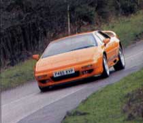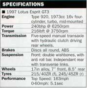 Our test car, the even curvier GT3, had a smaller engine that squirted 240bhp to its rear wheels but on a wet and cold stretch of Sussex scenery, it was enough for a little fun. The GT3 may lack the second back of cylinders and second turbo of the 32-valve V8 Esprit 350 (Not sure why they've quoted 350!, LEW), with more power per ton than the Nissan Skyline R34, it's not slouch.