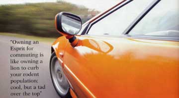 You need a fine blend of aggression, patience and finesse to get the best out of the Esprit on the limit but the car behaves will at more sedate speeds. Suspension is a little stiff for crashing through urban pot holes but it's liveable give the car's behaviour and potential on the open road. It's where the Esprit is designed to work at its best, so owning one for point to point urban commuting is like owning a lion to curb your rodent population, or using a flamethrower to light a cigarette: it's cool and it'll do the job, but it's a tad over the top.