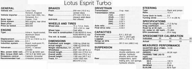 The handling dynamics are best described as confidence-building. After driving the car for a while, the driver gets comfortable with high speeds and begins to appreciate the inherent touring ability of this vehicle. High average speeds are possible make that easy for long periods without fatigue. At 100mph, the car settles into a solid 'harmonic', where all engine vibrations smooth out, wind noise is gone, the rotating masses of the wheels, tires, brake discs seem to cancel out even the mirrors are quiet and you find yourself turning the radio down just to enjoy the sensations. Strange thoughts emerge. Turbines . . . space vehicles . . . travelling through the void. The Esprit Turbo, in its element, successfully isolates its passengers from the trials of earthly transportation. It's a capsule that transports them from A to B, the tire contact patches the only grudging contact with the planet.