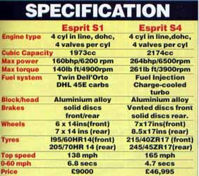 Brian Angus, the S4's project manager, strikes an interesting note when he talks about 'rediscovering the purity of the original Esprit, both in looks and performance'. Interesting when you consider that the supercar envisioned by the late Colin Chapman remained an ideal while, at best, the S1 turned out to be an artful compromise. Chapman originally wanted to build the Esprit in two forms; one with a high-efficiency four-cylinder engine, the other toting a small block V8. The energy crisis of the mid-70s had other ideas and, in league with tougher worldwide safety legislation, forced Lotus to build a bigger, heavier, slower and more expensive car than it would have liked. A prototype V8 was built but the fuel injection development costs were prohibitively high and the big V8 was put on ice. Instead Lotus ploughed the resources at its disposal into turbocharged version.