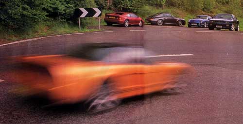 You'd imagine that nothing could live with the TVR on a quick road, especially as it boast suspension revisions, too. Yet deputy editor Meaden is having a hard time shaking off the 911. There are parallels here with the Esprit/NSX scenario. These roads are fast, demanding and difficult to read. They throw up shallow and tight corners randomly, some sighted and some not, so you're always on your toes.