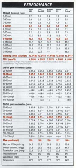 These revisions give the NSX the clout and cogs to match its bête noire, the Porsche 911. At 276 bhp (up a mere two ponies on the old motor) the Honda's engine is still a few horsepower down on the 285bhp Porsche, but in a zero to 100mph drag race the NSX gets there in 12.2 secs, a clear second ahead. Reality check: that's 10secs quicker than any of the hot hatches we tested last month.