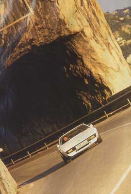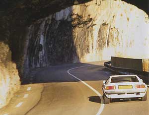 When you flick the well-hidden ignition key on the steering column beneath the instrument crescent, the coarse loingitudinally-mounted 16-valve engine adds itself instandly to the list of S1 plus points. It idles gruffly, especially when cold, but pricks up with a snarl the moment you think about touching the throttle. As you ease up the light clutch, the engine is reluctant to get things moving unless you use 2000rpm, owing to a combination of peaky cams for top-end power and a tall first gear. This makes for clumsy progresss through the stop-start traffic bunging up Monte Carlo's narrow streets, but once you've picked your way through the principality's labyrinth of rock-hewn tunnels and concealed bolt-holes, the Lotus gets quickly into its stride. A 6200rpm red-line means you can use all the 160bhp in the long first gear before notching the dainty little gearlever atop the transmission into the second of its five ratios. After much criticism of the old Europa's gearchange, it's great that the effort Lotus put into perfecting the Esprit's rod-and-cable gear linkage paid off so handsomely in fack, Tony Rudd once said the Esprit was worth the asking price for the gearchange alone, and you got the rest of the car free! Flicking between closely spaced third and fourth ratios, the Esprit laughs in the face of the twisty coast road to Nice, proving that you don't need the power of a locomotive to get a hurry on around the Cote d'Azur's fabulous roads. Only when you slot the lever far to the right for leggy fifth do you yearn for the power that later Esprits offer. No more will the S1 kick forward like a sprinter and spin its engine saucily up through the revs.