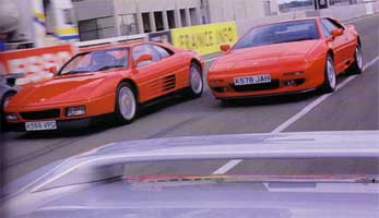 The difference between these two cars is hard to quantify in tangible terms. Both are very similar performers (less accelerative than the Esprit and 911, although the Ferrari has a higher top speed than the Lotus at 163mph) and, up to a point, both behave similarly on the road. Initially only the 348's greater steering feel and harder ride sets them apart.