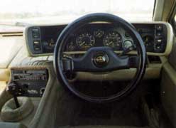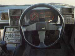 The Lotus is a terrible companion for a night on the town. Rear vision is appalling, especially to the rear flanks. As a result lane changing and reverse parking involve as much crossing of the fingers as good judgement. Front vision is not that great, either, owing to the low seating position. If you're a six-footer, like me, your nose will be pointing straight at the steering wheel boss. The wheel itself feels high: you almost have to reach up to grab it. Yet this inordinately low driving position is part of the magic of Turbo Esprit driving. The Lotus feels different from the road car norm, in a way that neither the 911 nor the GTA does. You don't so much climb onto the seat as fall into the gap between the sill and the centre console, and repose on flash looking (but in fact rather uncomfortable) seats. The steering wheel has a chunky rim, and is of tiny diameter. White on black gauges stare at you from every corner of the facia.