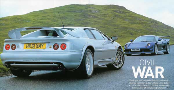 Though inseparable on paper, getting the two cars together on the road was Devils own job. In fact if it werent for Birmingham-based Nick Whale Sportcars, you wouldnt be reading this test at all. Britains most prolific Lotus dealership (300 new and used cars sold last year), NWS is also an official Noble dealer, and has just taken delivery of not only the first dealer demo M12 in the country but a new-look Esprit V8 as well. In an act of selfless generosity (would you loan us £100,000 worth of supercars?) both cars are ours for a day. Game on.