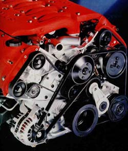 At launch, the belts are conventional Goodyear toothed type, but they were to have been Goddyear's new helical offset tooth (HOT) belt, whose self-aligning does away with the need for belt guides. Drive to the alternator, water pump, air conditioning and power steering pumps is by a separate serpentine belt outboard of the timing drive, so that if, for example, the water pump misbehaved, its seizing would not cause a catastrophic stopping of the camshaft drive.