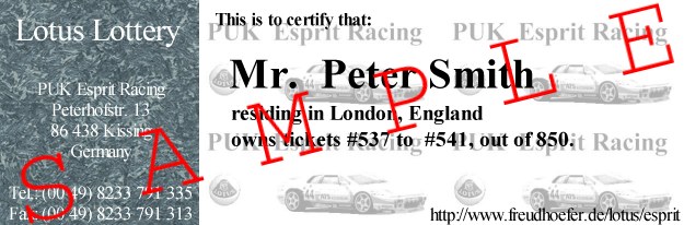 Dave Walter is making a batch of carbon fibre sunroofs for the Esprit. This will replace the glass roof and use the existing mountings. Prices are around £225 + p&p a present. Too find out more about it contact Dave at dave@acsdesign.org. Lotus Esprit World will be purchasing one and a guide and review will appear on the site in the near future. Lotus Lottery! PUK Esprit Racing Lotus