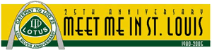 Lotus Ltd. and the St. Louis Area Lotus Lovers cordially invite all Lotus enthusiasts, owner or otherwise, to “Meet Me In St. Louis” August 26-29, 2005. Mark your calendars now for the silver anniversary of LOG in The Gateway City. Watch for more details on the Lotus Ltd. web site at www.LotusCarClub.org or contact LOG 25 chairman Mark Pfeffer at (314) 889-0572 or via e-mail: Feffman@Yahoo.com.–––––––––––––––