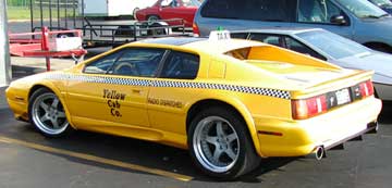 A yellow Cab Esprit! No information on if this Esprit is taking bookings, but with only one spare seat, it's not the best choice for a Taxi!This is the same Monster Esprit with rear wing removed from Denver USA. It's Johan's Nitrous intercooled 712bhp car. The car that did 210mph at Bonneville last year, he's trying for 225 right now.!!!!!