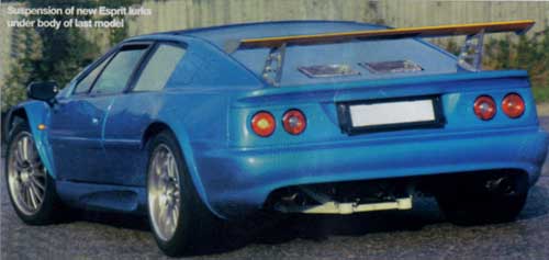 Unfortunately this isn't the new Esprits body! According to the motoring magazine, it's just the new suspension being tested on the old body. The article says very little about the new Esprit (as they more than likely don't know anything), only mentioning that various engine options are being looked at and now not to discount the old Lotus V8 turbo being used.From what you can see above, there's some nice touches to this test vehicle. LEW would love to get hold of the 350 style wing, mounted further forward and the engine vents look kind of cool. Not so sure about the front wheel arches and the Max Power style wheels. But as the chance of seeing any of this on the new Esprit is very unlikely, its a bit irrelevant.