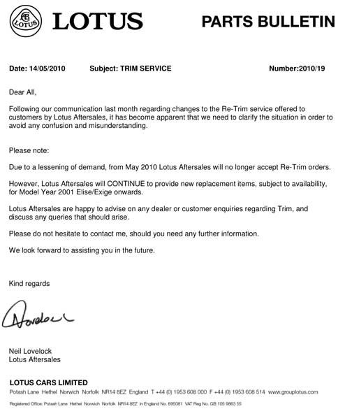 Lotus are allegedly prepared to close their excellent trim shop, which LEW have used to trim our seats and centre consol. We have seen brilliant work by the staff there and met many during a factory visit. It would be a sad trend to lose these skilled workings.TLF member Nick Page has set up a petition to show our support and request it remains. Please click below and sign the petition.